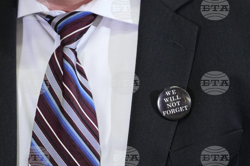 Austin Police Cold Case Detective Daniel Jackson wears a button he was given by a victim's family member during a news conference regarding a breakthrough in the 1991 I Can't Believe It's Yogurt murder case, Monday, Sept. 29, 2025, in San Antonio. (AP Photo/Eric Gay)