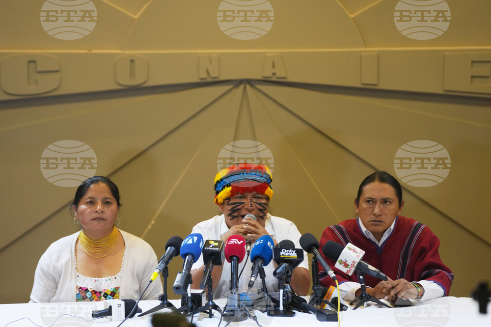 Indigenous leaders Ercilia Castaneda, left, Marlon Vargas, center, and Alberto Ainaguano give a press conference about protests against diesel price hikes following fuel subsidy cuts by President Daniel Noboa's government, in Quito, Ecuador, Monday, Sept. 29, 2025. (AP Photo/Dolores Ochoa)