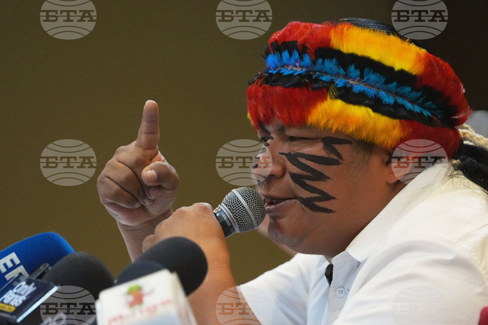 Indigenous leader Marlon Vargas gives a press conference about protests against diesel price hikes following fuel subsidy cuts by President Daniel Noboa's government, in Quito, Ecuador, Monday, Sept. 29, 2025. (AP Photo/Dolores Ochoa)