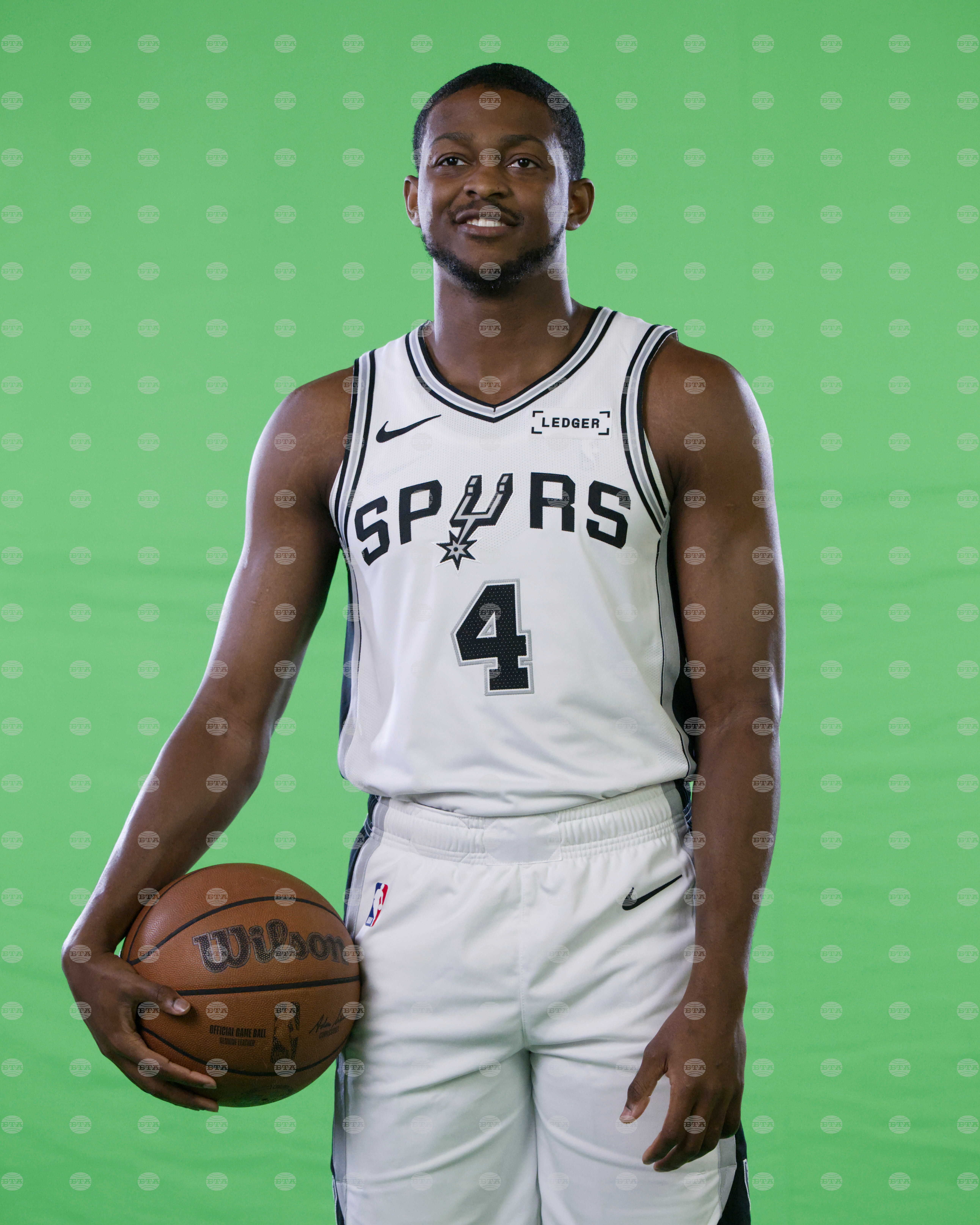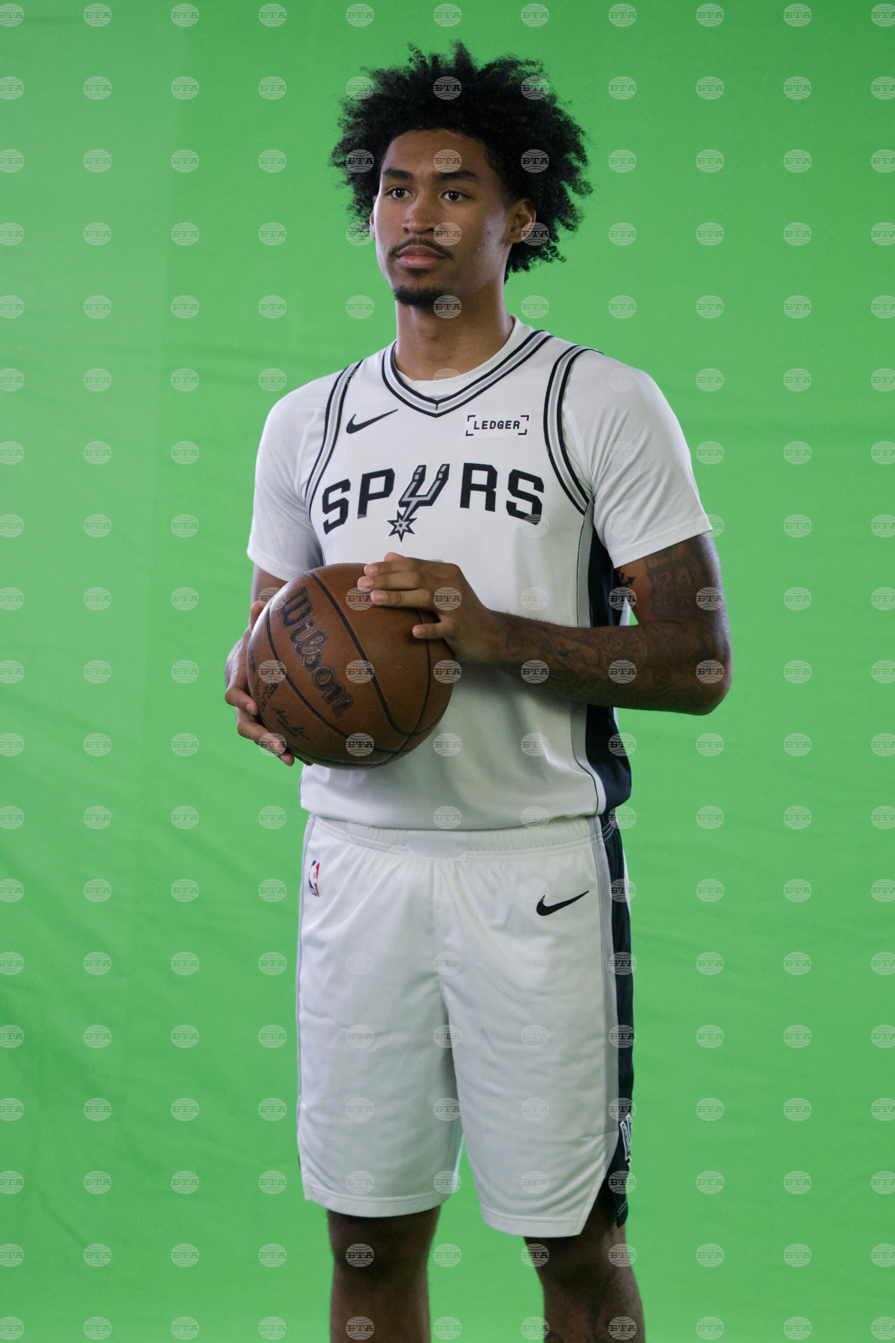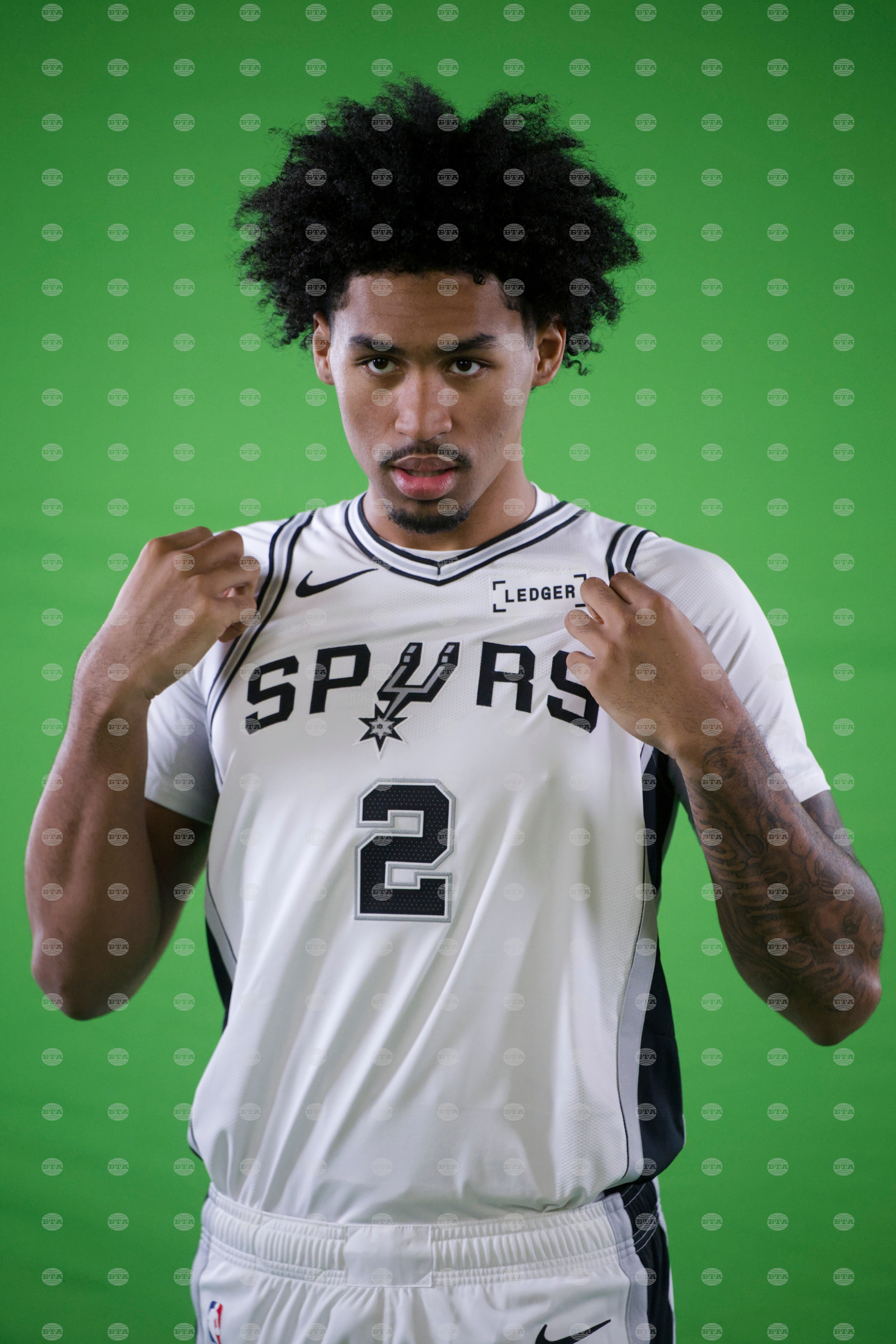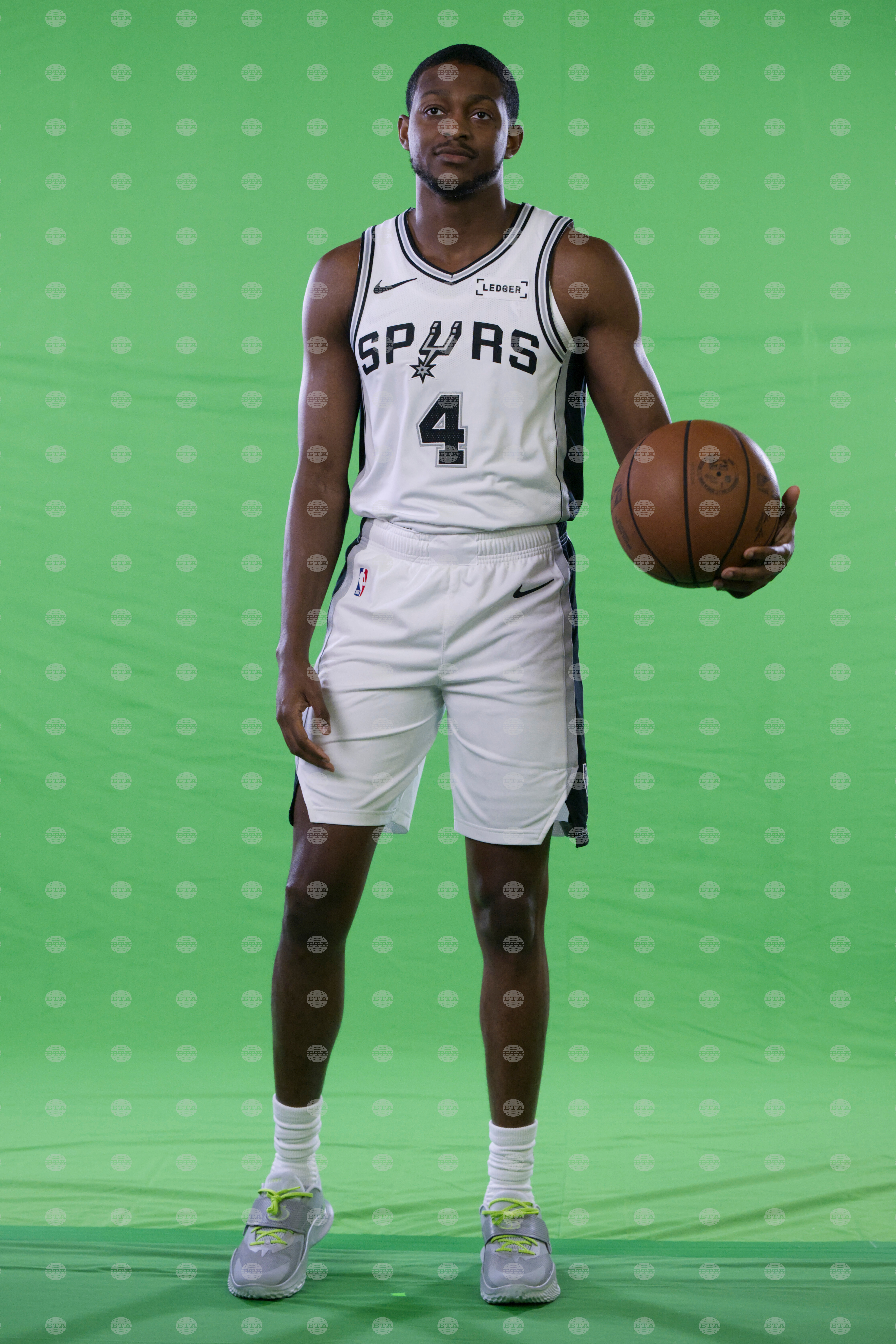 San Antonio Spurs forward Jeremy Sochan poses during the NBA basketball team's media day in San Antonio, Monday, Sept. 29, 2025. (AP Photo/Darren Abate)