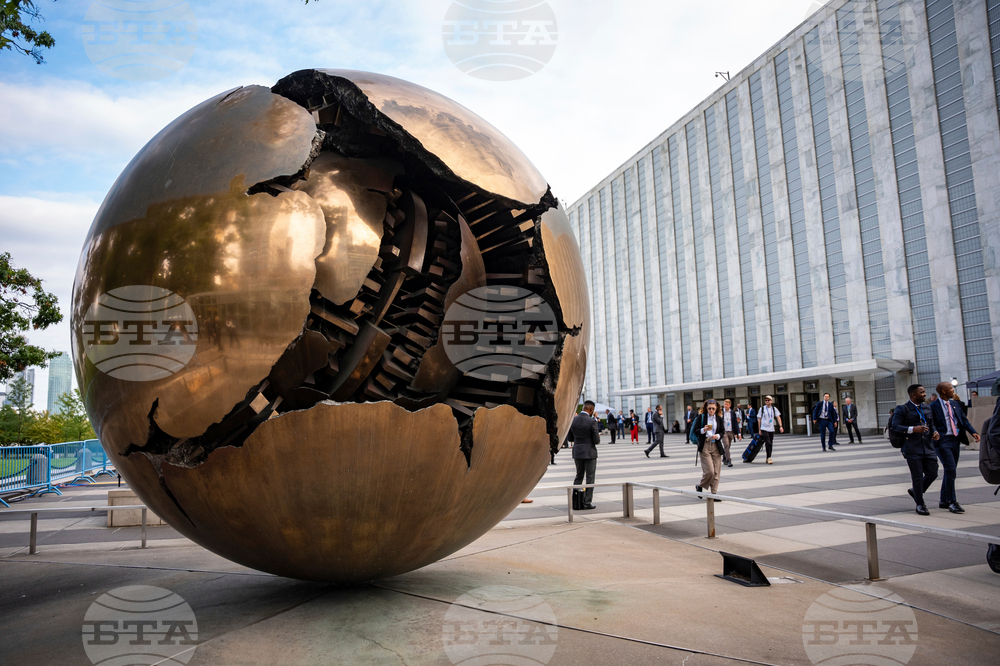 FILE - People walk around the plaza by the Sphere Within Sphere outside the United Nations Headquarters on the first day of the 80th session of the UN General Assembly's High-Level week, Monday, Sept. 22, 2025. (AP Photo/Angelina Katsanis, File)