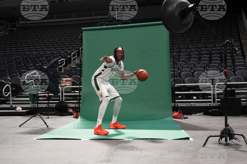 Milwaukee Bucks Myles Turner poses with his assistant coaches for a photo during the team's NBA basketball media day Monday, Sept. 29, 2025, in Milwaukee. (AP Photo/Morry Gash)