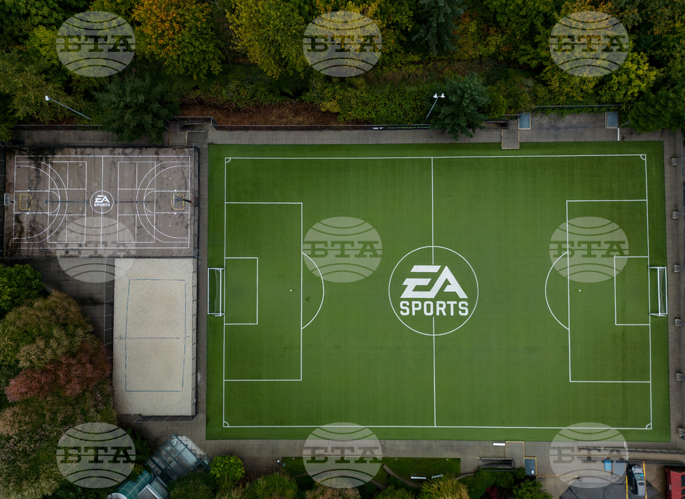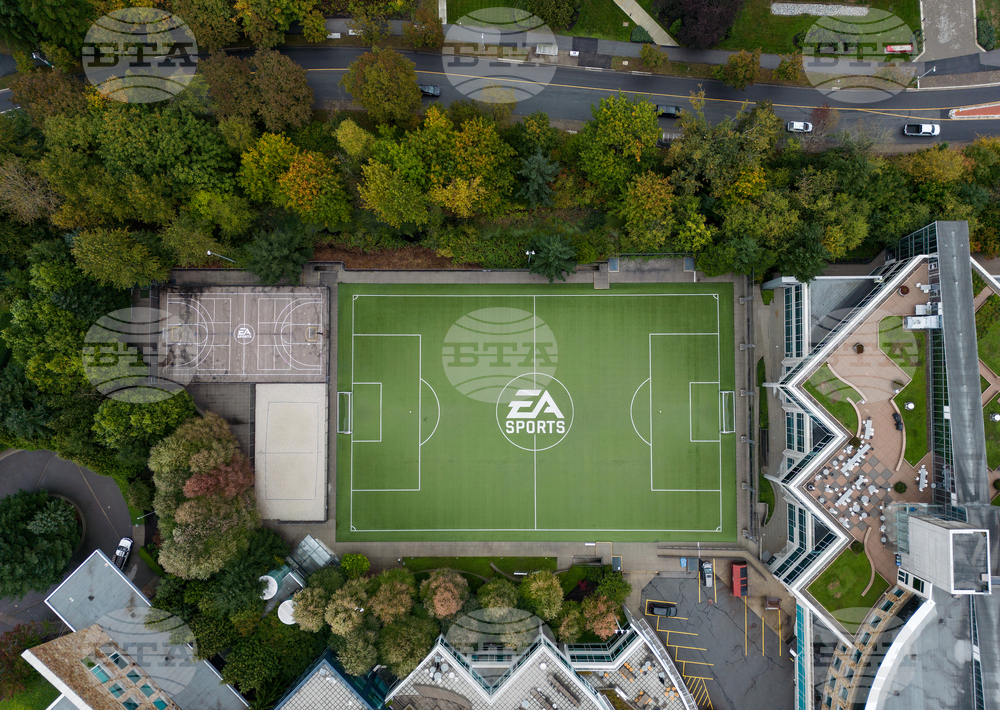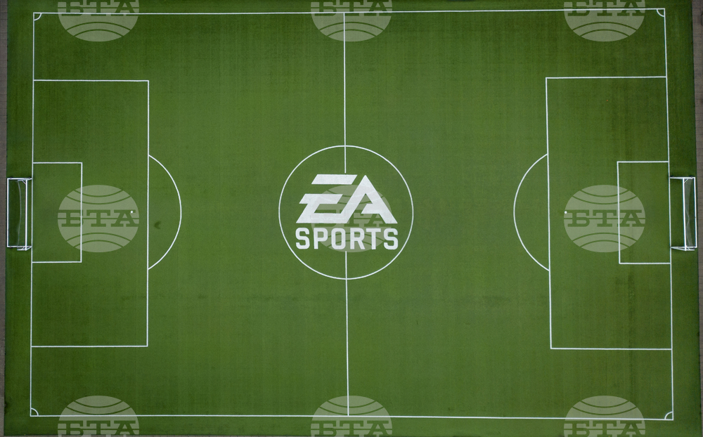 The EA Sports logo is seen on a soccer pitch at the Electronic Arts' office and studio complex, in Burnaby, British Columbia, Monday, Sept. 29, 2025. (Darryl Dyck/The Canadian Press via AP)