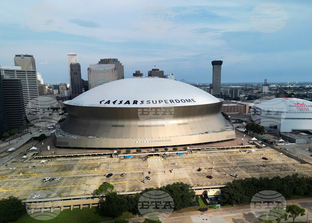 FILE - An aerial overall exterior general view of Caesars Superdome and the Smoothie King Center with the New Orleans skyline in the background is seen after an NFL preseason football game between the New Orleans Saints and the Denver Broncos in New Orleans, Saturday, Aug. 23, 2024. (AP Photo/Tyler Kaufman, file)