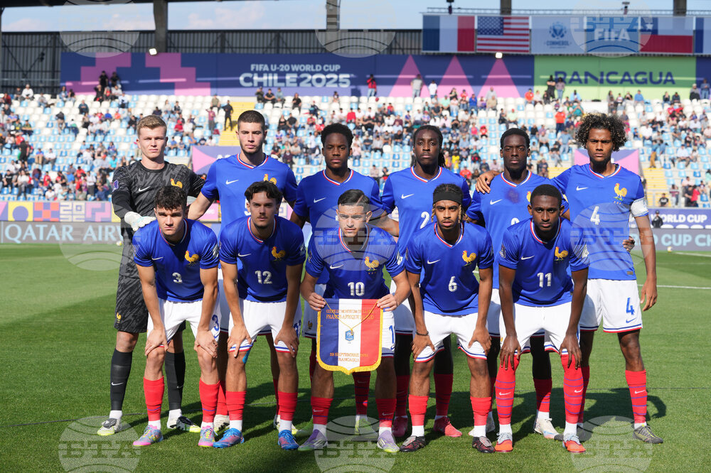 France's players pose for a team photo before a FIFA U-20 World Cup Group E soccer match against South Africa at El Teniente Stadium in Rancagua, Chile, Monday, Sept. 29, 2025. (AP Photo/Andre Penner)