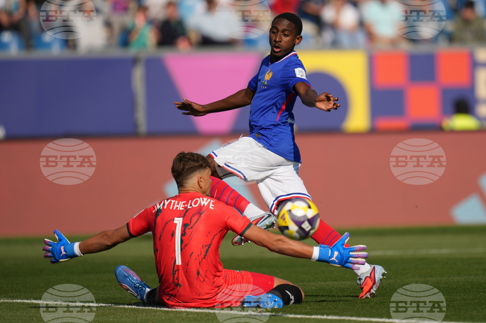 France's Tadjidine Mmadi, top, shoots against South Africa's goalkeeper Fletcher Smythe-Lowe during a FIFA U-20 World Cup Group E soccer match at El Teniente Stadium in Rancagua, Chile, Monday, Sept. 29, 2025. (AP Photo/Andre Penner)