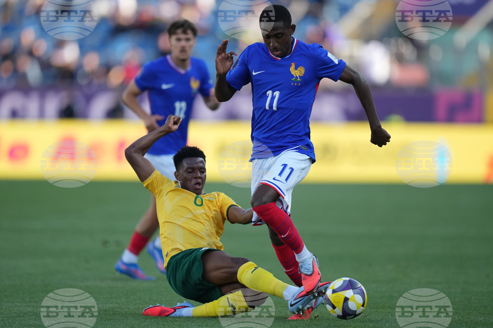 France's Rabby Nzingoula, right, battles for the ball with South Africa's Lazola Maku during a FIFA U-20 World Cup Group E soccer match at El Teniente Stadium in Rancagua, Chile, Monday, Sept. 29, 2025. (AP Photo/Andre Penner)