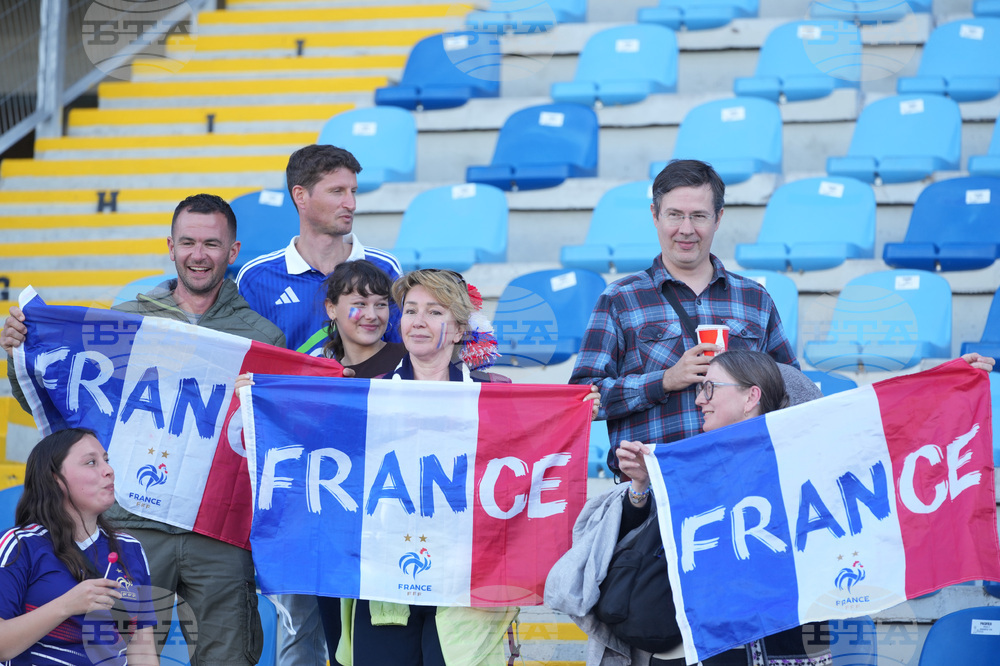 France fans hold flags during a FIFA U-20 World Cup Group E soccer match against South Africa at El Teniente Stadium in Rancagua, Chile, Monday, Sept. 29, 2025. (AP Photo/Andre Penner)