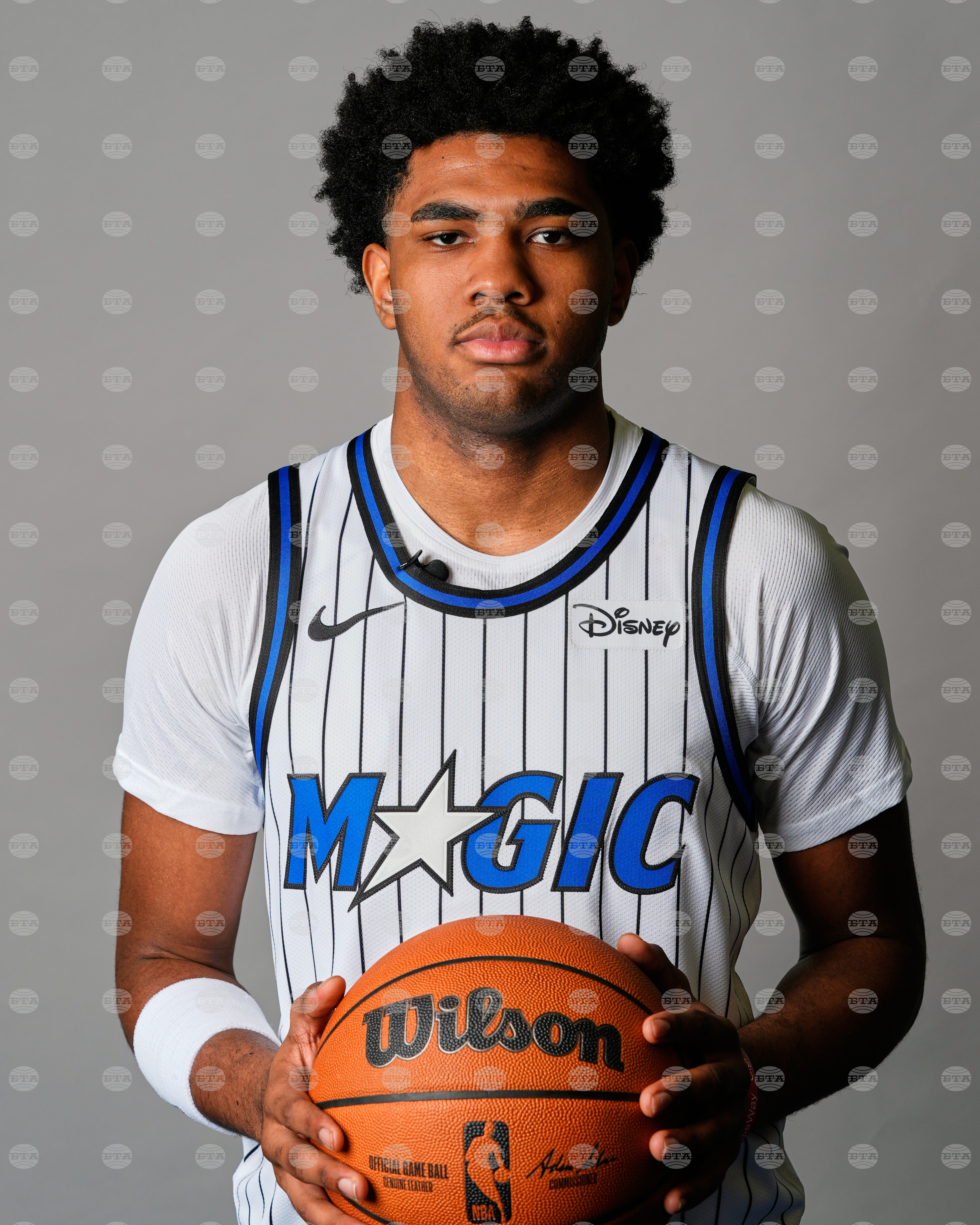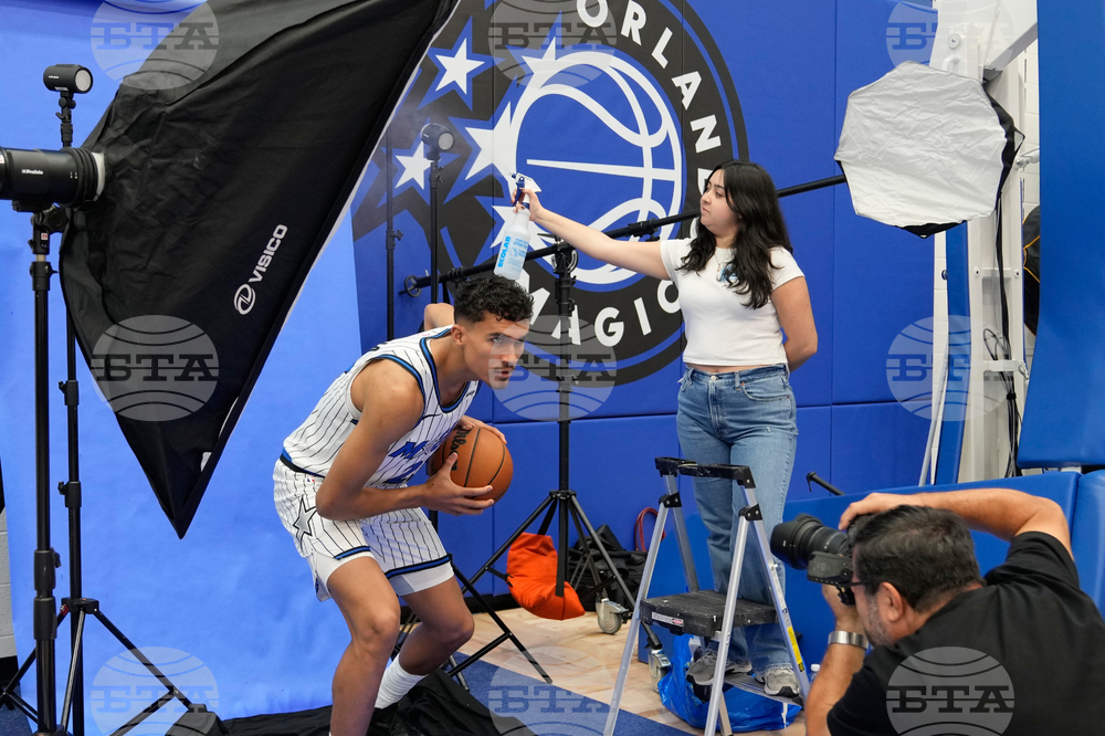 Orlando Magic guard Anthony Black tosses a ball as he poses for a photographer during the NBA basketball team's Media Day, Monday, Sept. 29, 2025, in Orlando, Fla. (AP Photo/John Raoux)