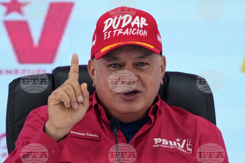 Minister of Interior, Justice and Peace Diosdado Cabello, center, speaks at a United Socialist Party of Venezuela (PSUV) press conference in Caracas, Venezuela, Monday, Sept. 29, 2025. (AP Photo/Ariana Cubillos)