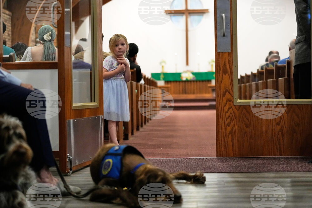 A child looks out from the pew during a service for the Sunday morning shooting at The Church of Jesus Christ of Latter-day Saints in Grand Blanc Township, Mich., Monday, Sept. 29, 2025. (AP Photo/Ryan Sun)
