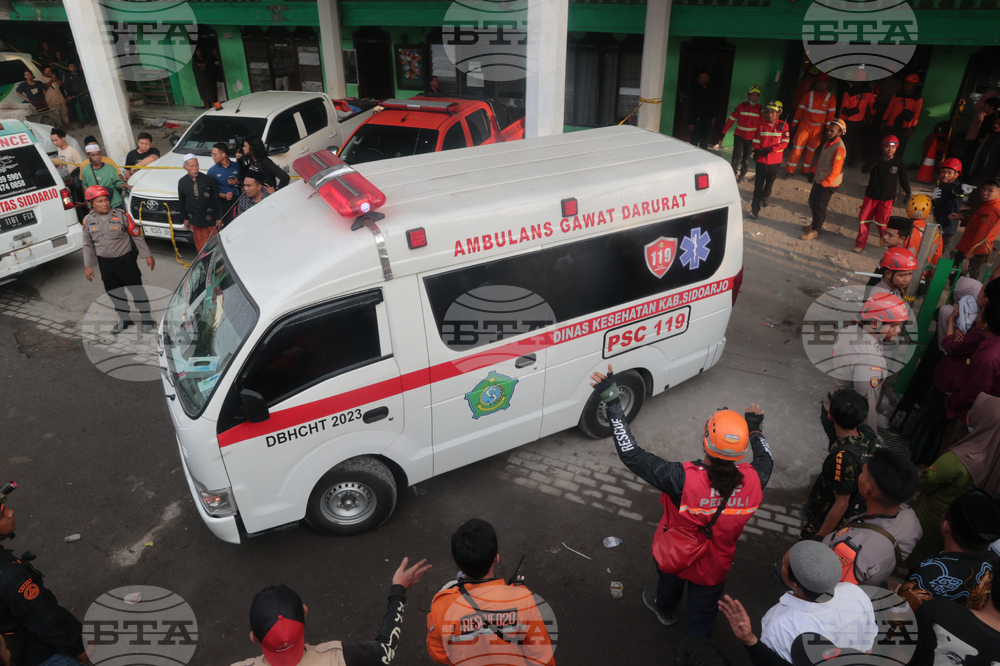 An ambulance parks outside the compound where a building under construction collapsed at an Islamic boarding school in Sidoarjo, East Java, Indonesia, Tuesday, Sept. 30, 2025. (AP Photo/Trisnadi)
