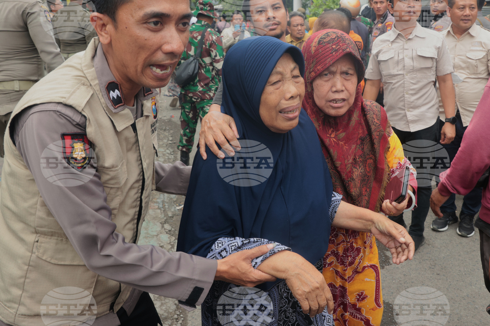 Women react as they move away after a building collapsed at an Islamic boarding school in Sidoarjo, East Java, Indonesia, Tuesday, Sept. 30, 2025. (AP Photo/Trisnadi)