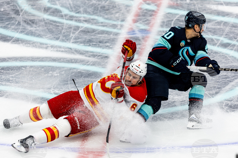 Calgary Flames defenseman Kevin Bahl (6) defends against Seattle Kraken center Matty Beniers (10) during overtime of an NHL hockey game Monday, Sept. 29, 2025, in Seattle. (AP Photo/Maddy Grassy)