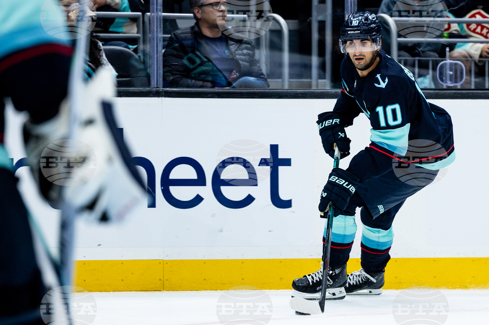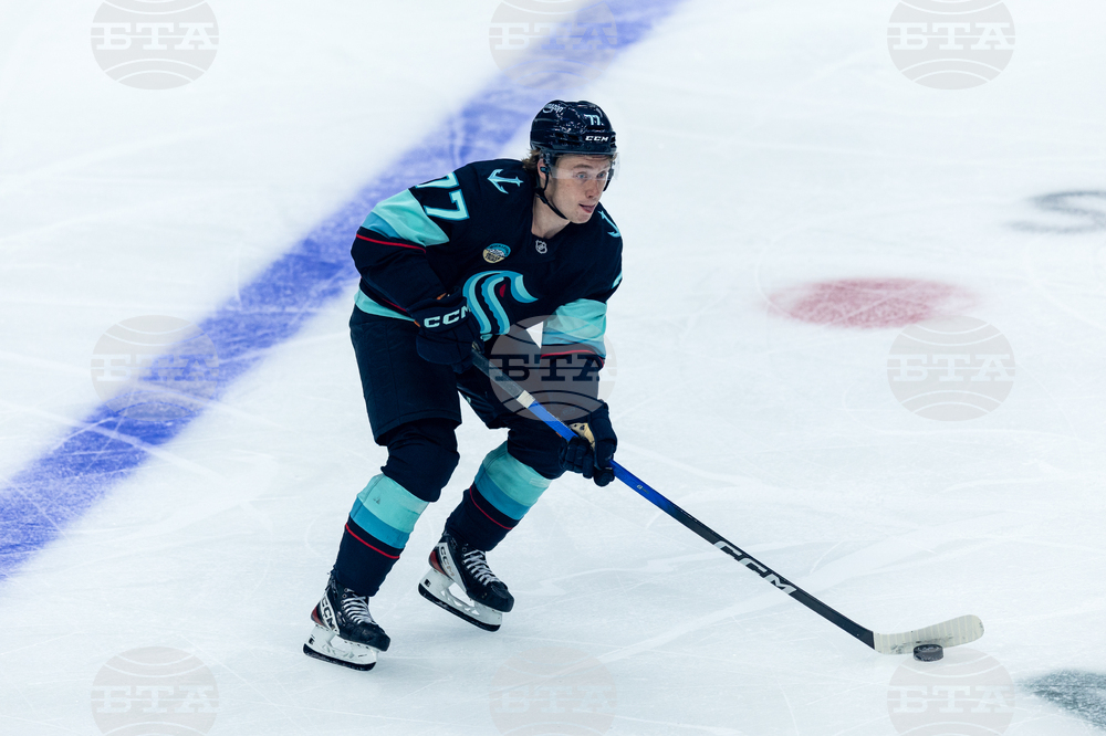 Seattle Kraken center Matty Beniers skates with the puck during the third period of an NHL hockey game against the Calgary Flames, Monday, Sept. 29, 2025, in Seattle. (AP Photo/Maddy Grassy)