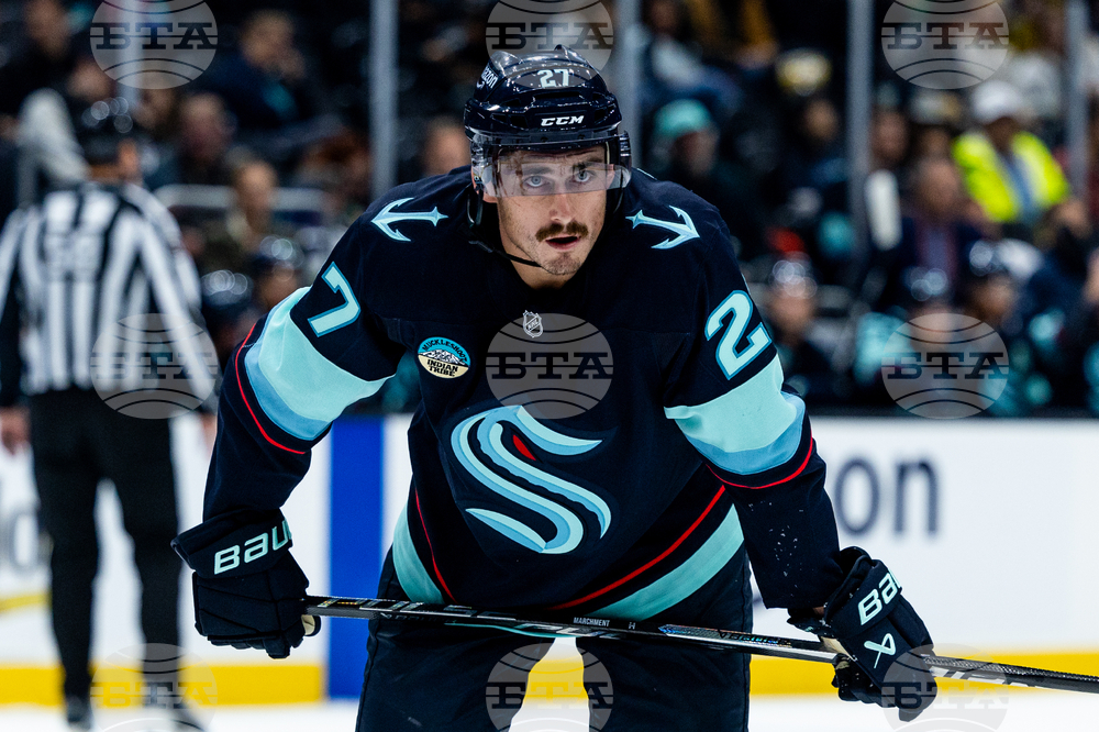Seattle Kraken left wing Mason Marchment looks on during the second period of an NHL hockey game against the Calgary Flames, Monday, Sept. 29, 2025, in Seattle. (AP Photo/Maddy Grassy)
