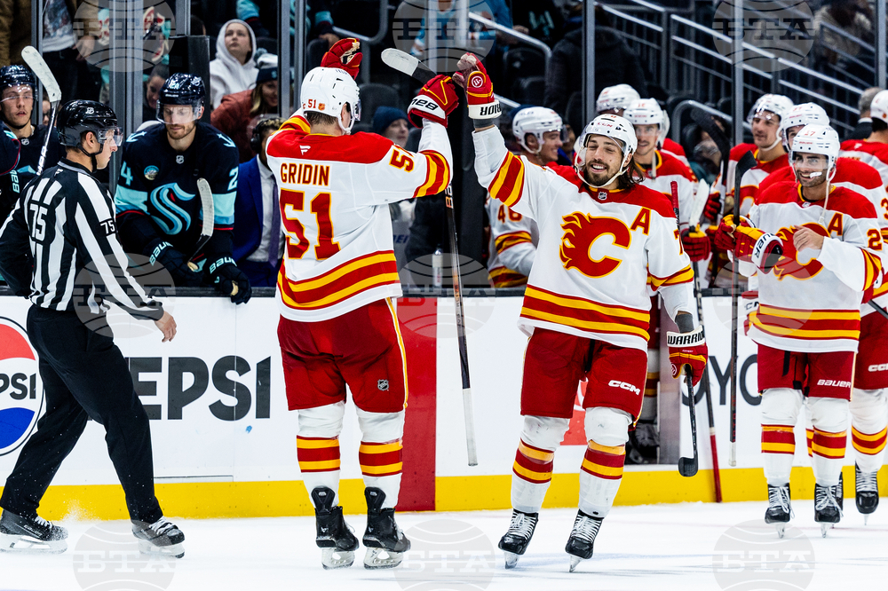Calgary Flames right wing Matvei Gridin skates during the second period of an NHL hockey game against the Seattle Kraken, Monday, Sept. 29, 2025, in Seattle. (AP Photo/Maddy Grassy)