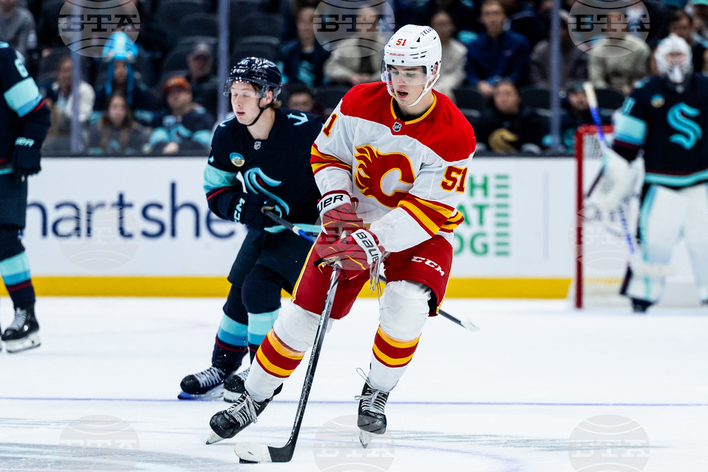 Calgary Flames right wing Matvei Gridin (51) skates during the second period of an NHL hockey game against the Seattle Kraken, Monday, Sept. 29, 2025, in Seattle. (AP Photo/Maddy Grassy)