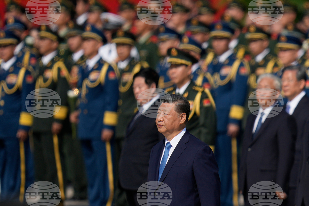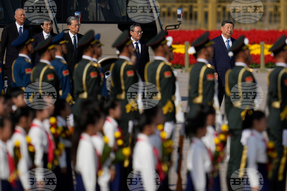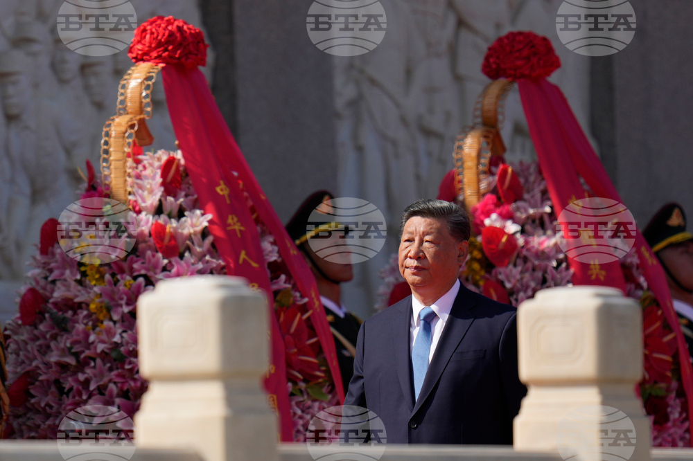 China's top leaders including Chinese President Xi Jinping attend a ceremony to present flower baskets to deceased national heroes at the Monument to the People's Heroes to mark Martyrs' Day on Tiananmen Square in Beijing, China, Tuesday, Sept. 30, 2025. (AP Photo/Ng Han Guan)