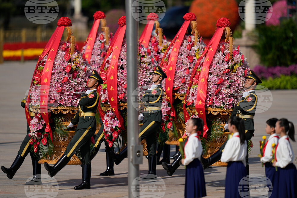 Honor guard members present flower baskets to deceased national heroes at the Monument to the People's Heroes to mark Martyrs' Day on Tiananmen Square in Beijing, China, Tuesday, Sept. 30, 2025. (AP Photo/Ng Han Guan)