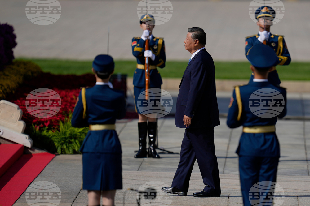 Chinese President Xi Jinping, right, arrives for a ceremony to present flower baskets to deceased national heroes at the Monument to the People's Heroes to mark Martyrs' Day on Tiananmen Square in Beijing, China, Tuesday, Sept. 30, 2025. (AP Photo/Ng Han Guan)