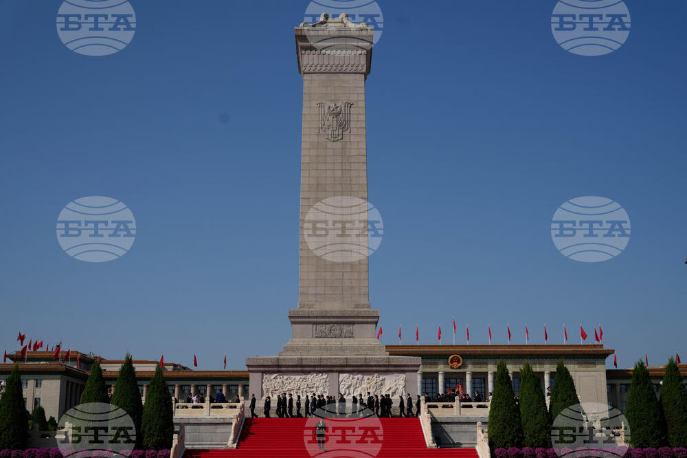 China's top leaders attend a ceremony to present flower baskets to deceased national heroes at the Monument to the People's Heroes to mark Martyrs' Day on Tiananmen Square in Beijing, China, Tuesday, Sept. 30, 2025. (AP Photo/Ng Han Guan)