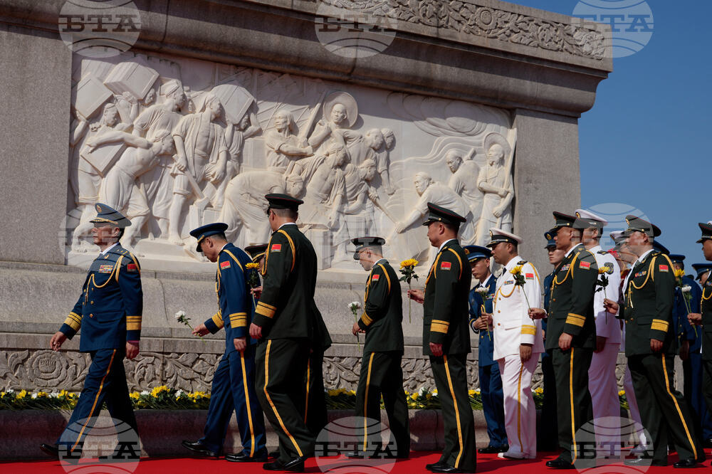 Military personnel lay flowers at the foot of the Monument to the People's Heroes during a ceremony to mark Martyrs' Day at Tiananmen Square in Beijing, China, Tuesday, Sept. 30, 2025. (AP Photo/Ng Han Guan)
