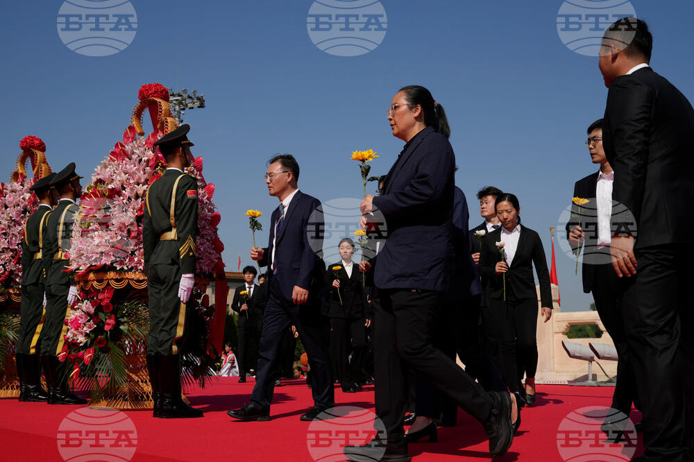 Attendees lay flowers at the foot of the Monument to the People's Heroes during a ceremony to mark Martyrs' Day at Tiananmen Square in Beijing, China, Tuesday, Sept. 30, 2025. (AP Photo/Ng Han Guan)