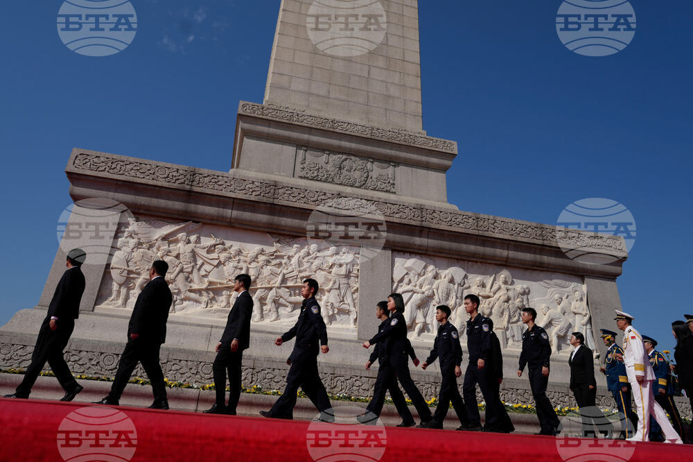 Chinese military personnel leave after attending a ceremony to present flower baskets to deceased national heroes at the Monument to the People's Heroes to mark Martyrs' Day on Tiananmen Square in Beijing, China, Tuesday, Sept. 30, 2025. (AP Photo/Ng Han Guan)