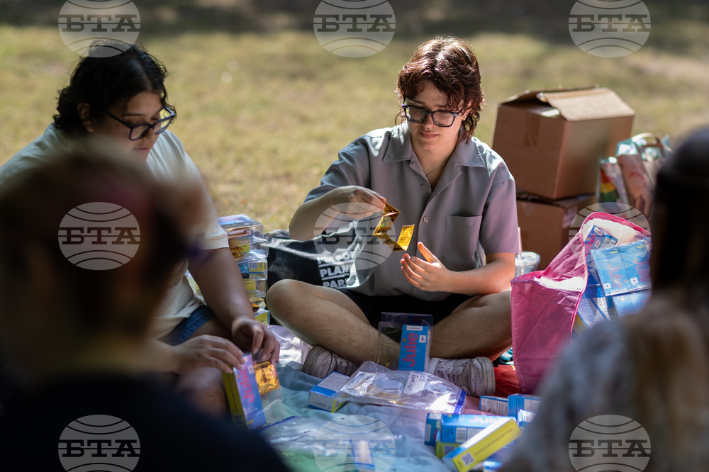DePaul University senior Mak Roban, 20, center, assembles a kit of contraceptive supplies at Oz Park in Chicago on Sunday, Sept. 28, 2025. (AP Photo/Heidi Zeiger)