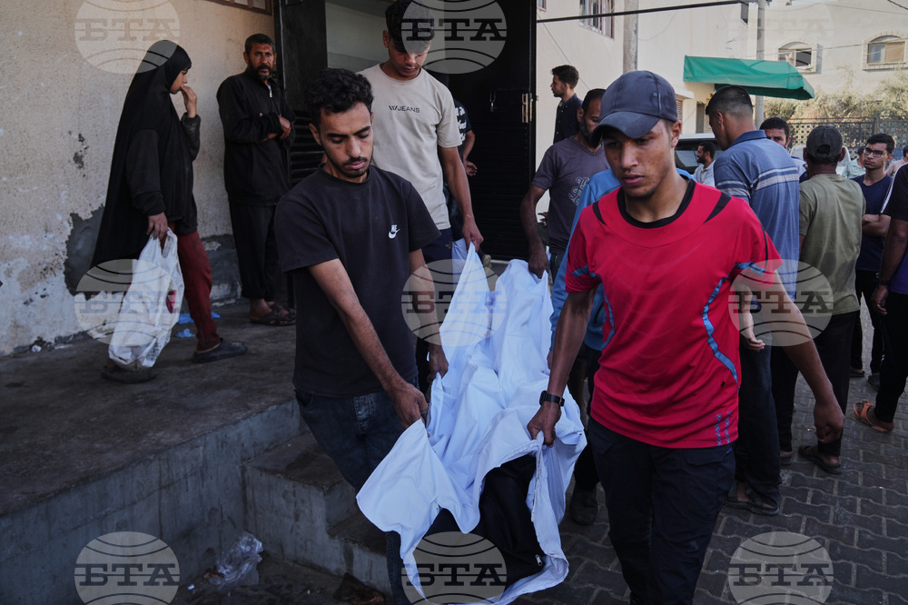 Palestinians carry the body of their relative, killed in an Israeli military strike, at the Al-Aqsa Hospital in Deir al-Balah, central Gaza Strip, Tuesday, Sept. 30, 2025. (AP Photo/Abdel Kareem Hana)