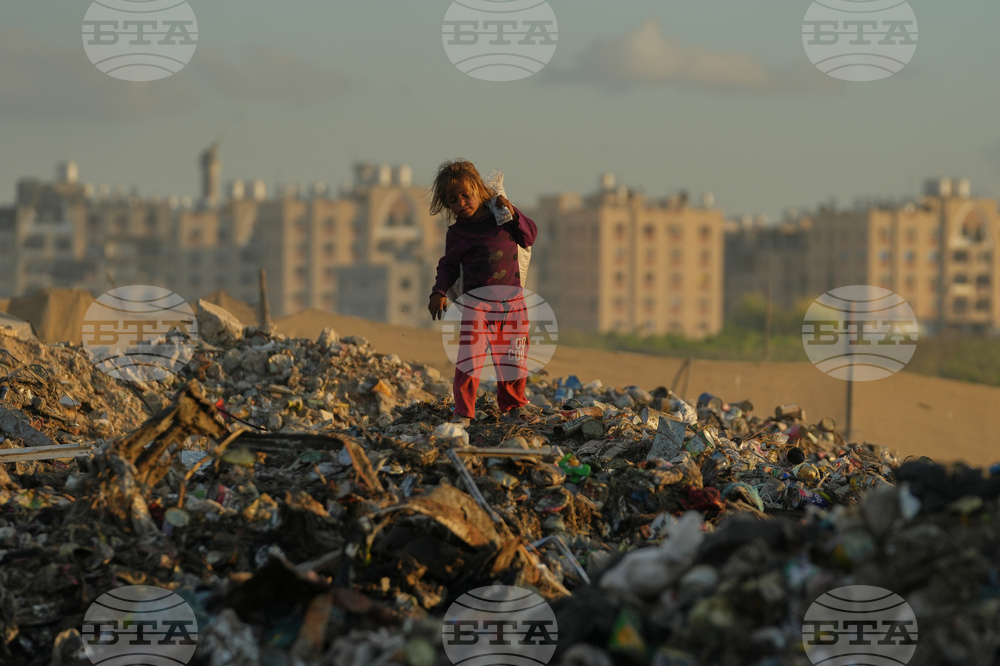 A displaced Palestinian girl searches for firewood and plastic in a landfill beside the makeshift tent camp where she family are taking shelter, in Khan Younis, southern Gaza Strip, Tuesday, Sept. 30, 2025. (AP Photo/Jehad Alshrafi)