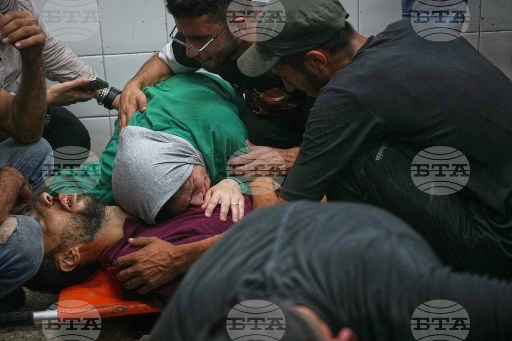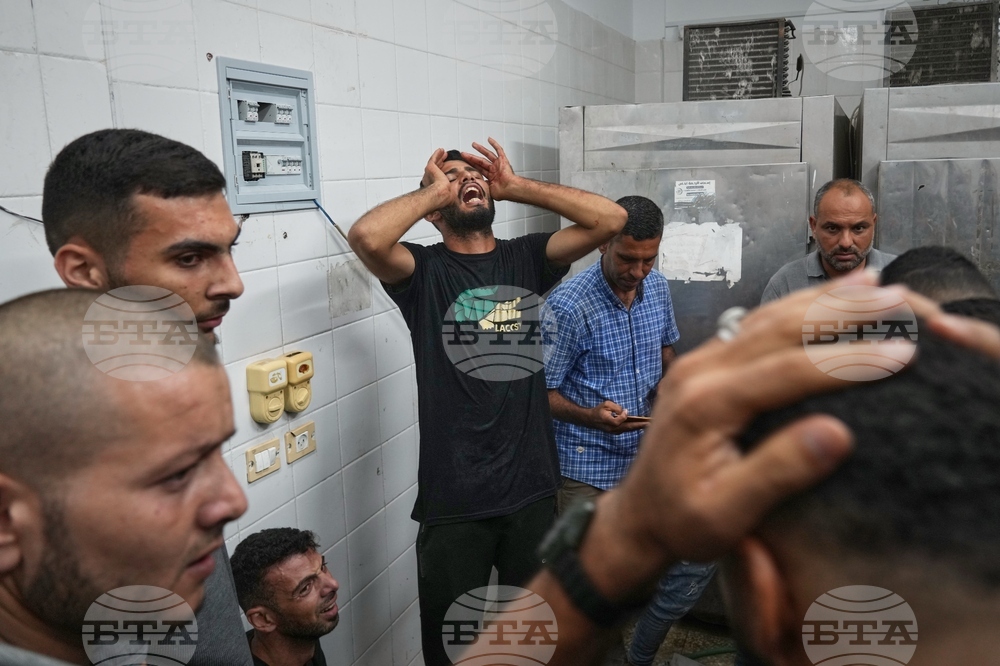 Relatives mourn over the family members killed in an Israeli strike on a carpentry shop and a café, at the Al-Aqsa Hospital in Deir al-Balah in the central Gaza Strip, Tuesday, Sept. 30, 2025.(AP Photo/Abdel Kareem Hana)