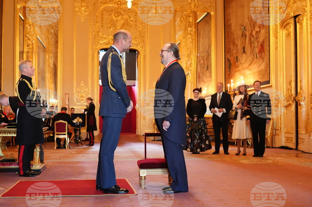 Actor Gary Oldman is made a Knight Bachelor by Britain's Prince William, the Prince of Wales, at Windsor Castle, in Windsor, England, Tuesday, Sept. 30, 2025. (Jonathan Brady/PA via AP)