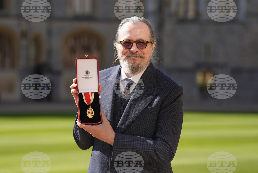 Actor Gary Oldman poses for a photo after being made a Knight Bachelor at an investiture ceremony at Windsor Castle, in Windsor, England, Tuesday, Sept. 30, 2025. (Andrew Matthews/Pool Photo via AP)