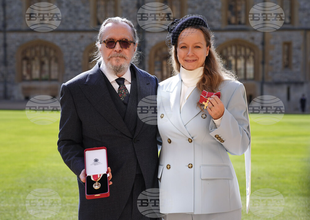 Samantha Morton and Gary Oldman pose for a photo after he was made a Knight Bachelor and Morton an Officer of the Order of the British Empire at an investiture ceremony at Windsor Castle, in Windsor, England, Tuesday, Sept. 30, 2025. (Andrew Matthews/Pool Photo via AP)