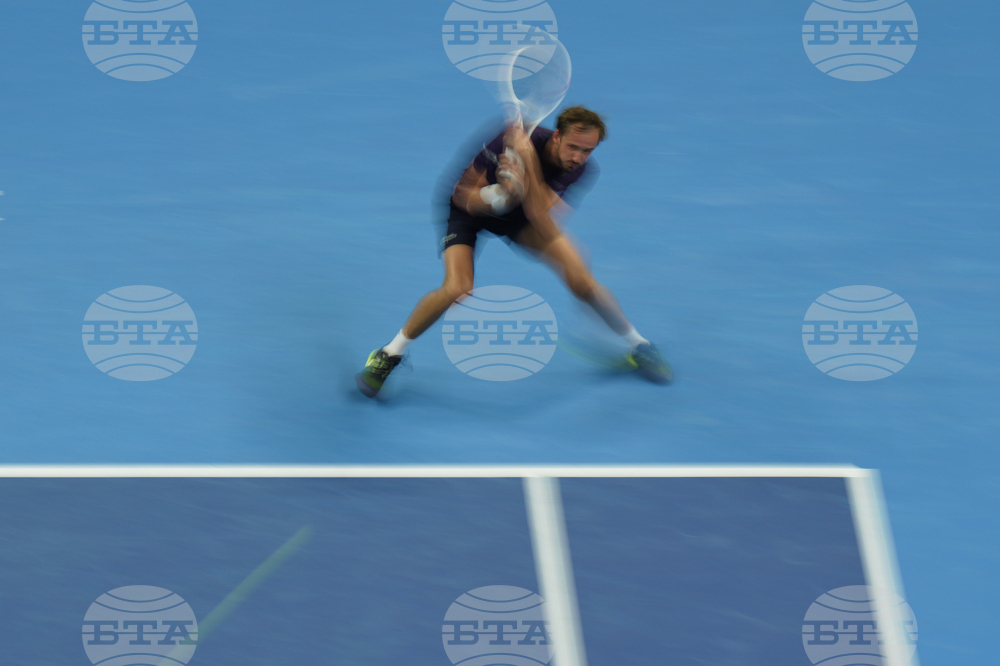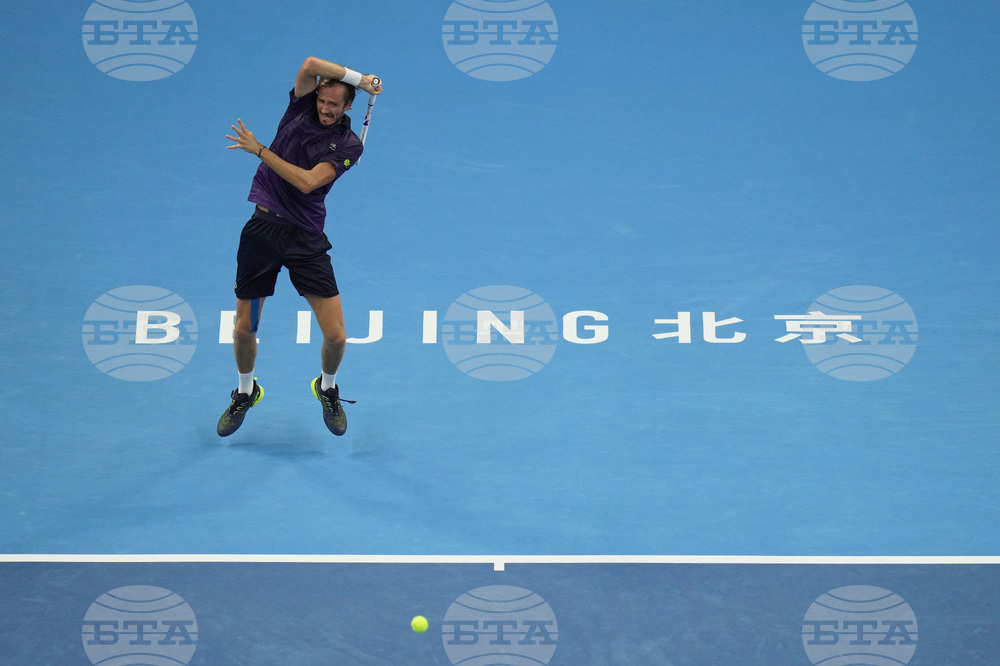 Russia's Daniil Medvedev returns a forehand shot to Learner Tien of the United States during the men's singles semifinal match for the China Open tennis tournament, in Beijing, China, Tuesday, Sept. 30, 2025. (AP Photo/Mahesh Kumar A.)