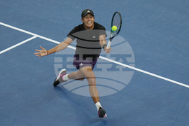 Learner Tien of the United States returns a forehand shot to Daniil Medvedev of Russia during the men's singles semifinal match for the China Open tennis tournament, in Beijing, China, Tuesday, Sept. 30, 2025. (AP Photo/Mahesh Kumar A.)