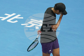 Amanda Anisimova, of the United States reacts after losing a point to Karolina Muchova, of the Czech Republic during the women's singles match of the China Open tennis tournament, in Beijing, Tuesday, Sept. 30, 2025. (AP Photo/Andy Wong)