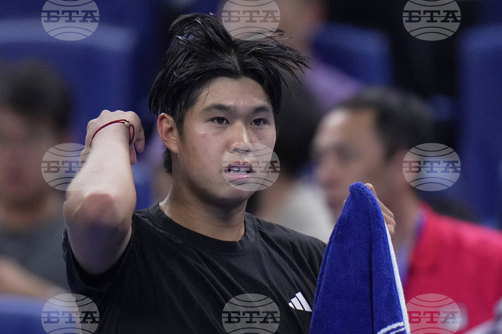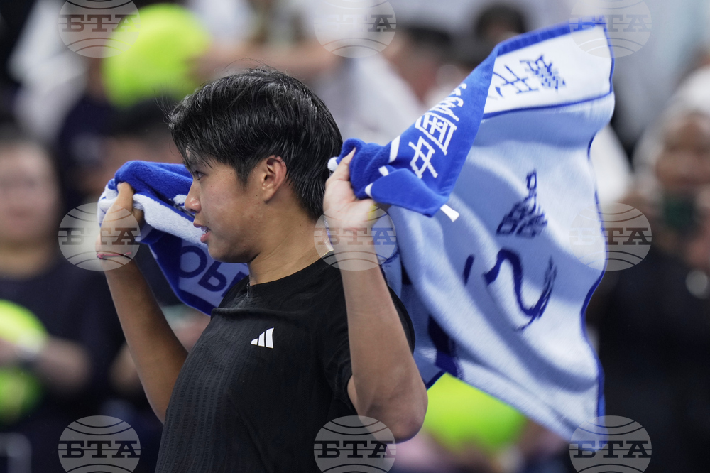 Learner Tien, of the United States reacts after Daniil Medvedev, of Russia retired from the men's singles semifinals match of the China Open tennis tournament, in Beijing, Tuesday, Sept. 30, 2025. (AP Photo/Andy Wong)