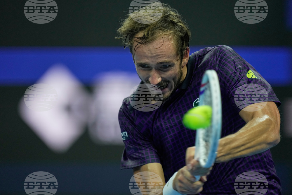 Russia's Daniil Medvedev returns a backhand shot to Learner Tien of the United States during the men's singles semifinal match for the China Open tennis tournament, in Beijing, China, Tuesday, Sept. 30, 2025. (AP Photo/Mahesh Kumar A.)