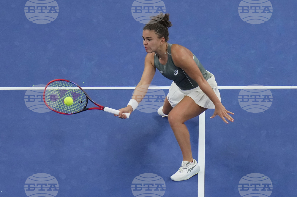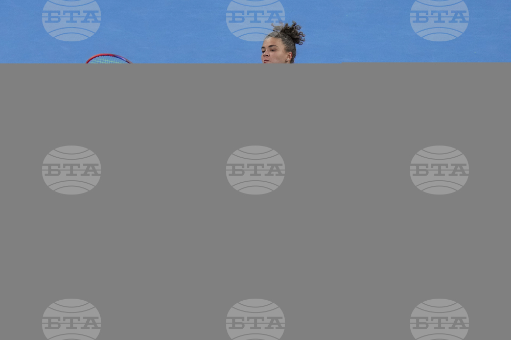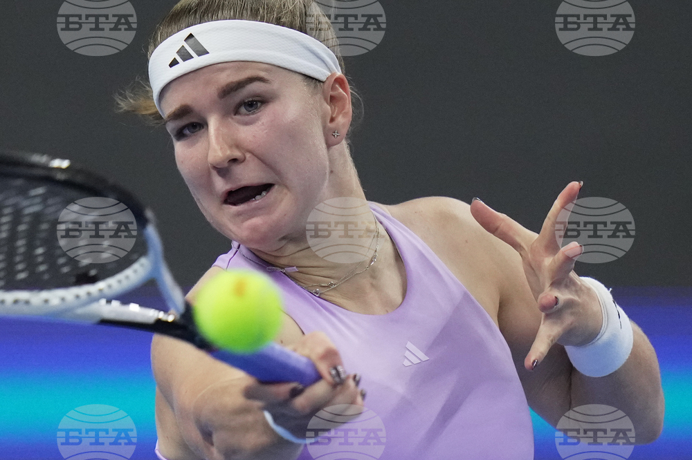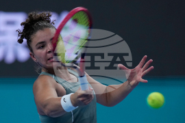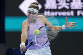 Marie Bouzkova of the Czech Republic plays a shot against Jasmine Paolini of Italy during the women's singles match of the China Open tennis tournament in Beijing, Tuesday, Sept. 30, 2025. (AP Photo/Mahesh Kumar A.)