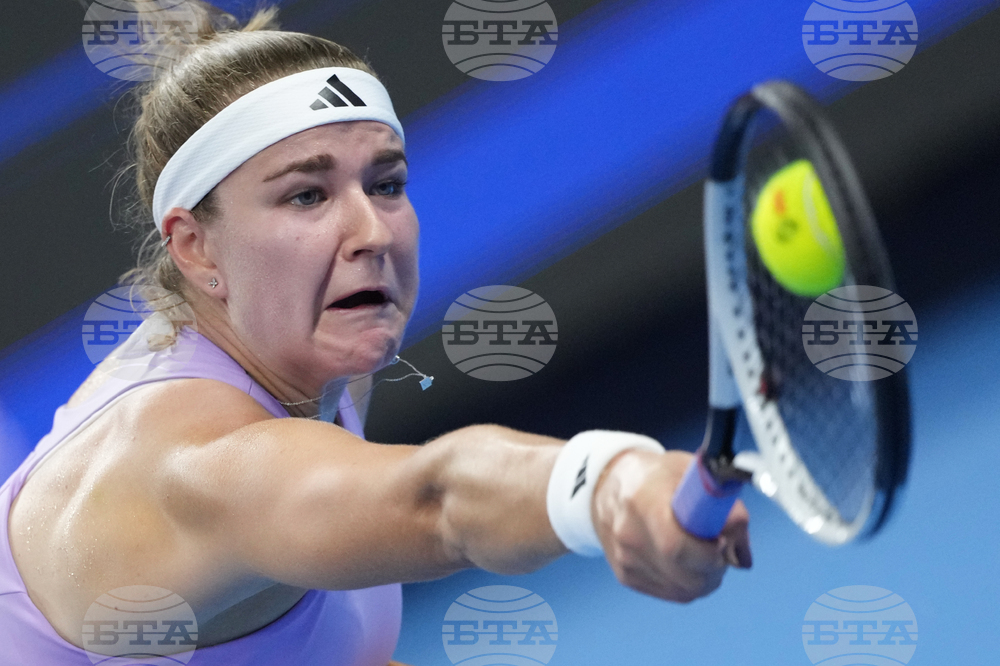 Karolina Muchova, of the Czech Republic returns a forehand shot from Amanda Anisimova, of the United States during the women's singles match of the China Open tennis tournament, in Beijing, Tuesday, Sept. 30, 2025. (AP Photo/Andy Wong)