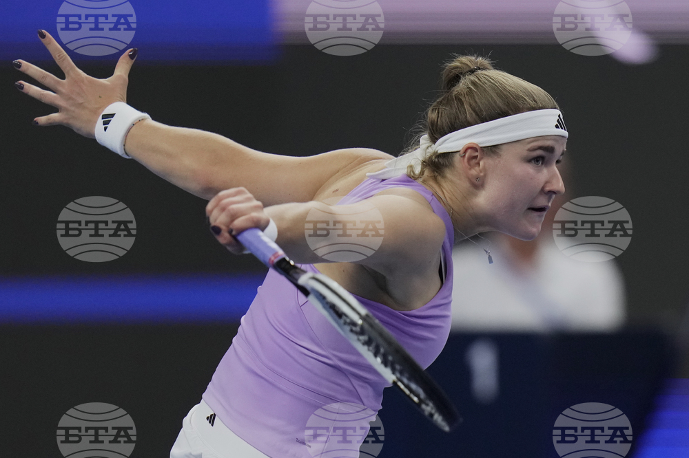 Marie Bouzkova, of the Czech Republic serves against Jasmine Paolini, of Italy during the women's singles match of the China Open tennis tournament, in Beijing, Tuesday, Sept. 30, 2025. (AP Photo/Andy Wong)