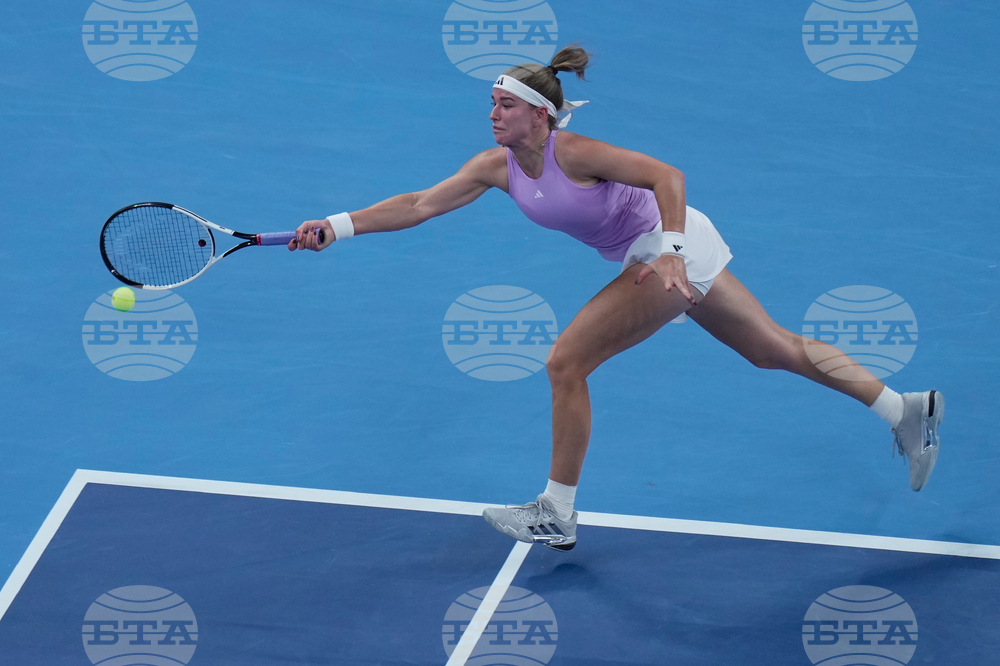 Amanda Anisimova of the U.S. returns a forehand shot from Karolina Muchova of the Czech Republic during the women's singles match of the China Open tennis tournament in Beijing, Tuesday, Sept. 30, 2025. (AP Photo/Mahesh Kumar A.)