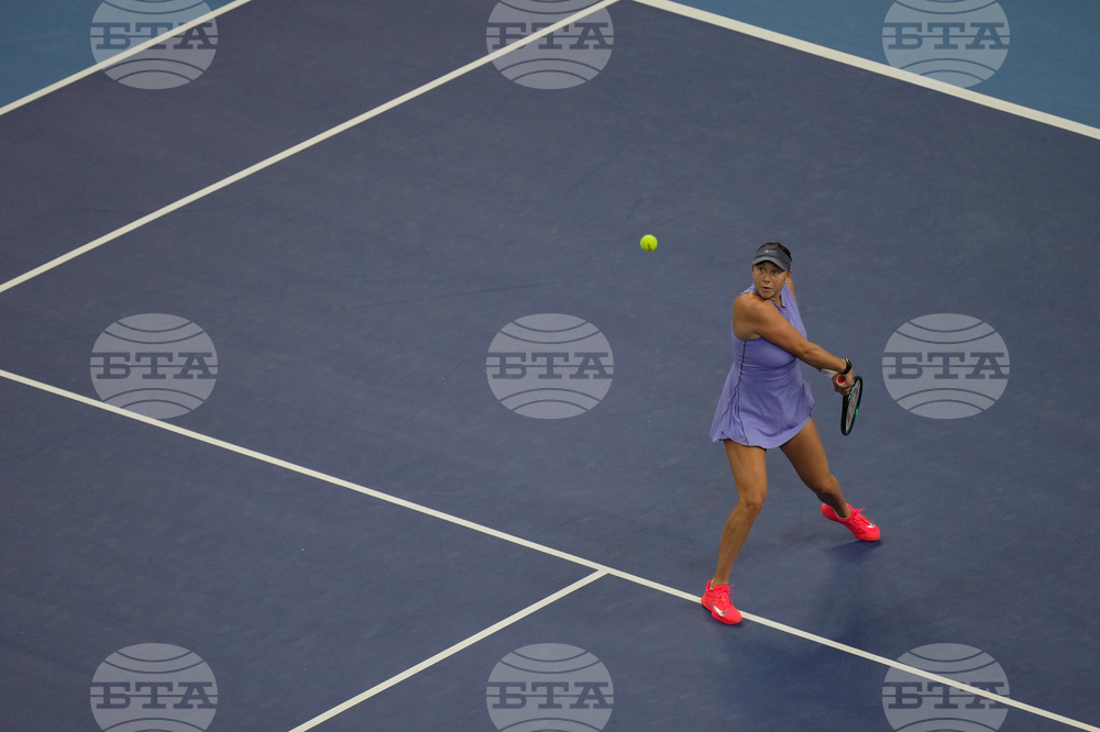 Marie Bouzkova, of the Czech Republic plays a forehand return to Jasmine Paolini, of Italy during the women's singles match of the China Open tennis tournament, in Beijing, Tuesday, Sept. 30, 2025. (AP Photo/Andy Wong)