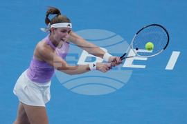 Karolina Muchova, of the Czech Republic watches her shot as she plays against Amanda Anisimova, of the United States during the women's singles match of the China Open tennis tournament, in Beijing, Tuesday, Sept. 30, 2025. (AP Photo/Andy Wong)