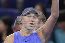 Amanda Anisimova, of the United States reacts after defeating Karolina Muchova, of the Czech Republic during the women's singles match of the China Open tennis tournament, in Beijing, Tuesday, Sept. 30, 2025. (AP Photo/Andy Wong)