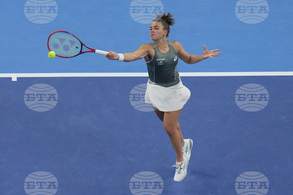 Jasmine Paolini, of Italy returns a backhand shot from Marie Bouzkova, of the Czech Republic during the women's singles match of the China Open tennis tournament, in Beijing, Tuesday, Sept. 30, 2025. (AP Photo/Andy Wong)