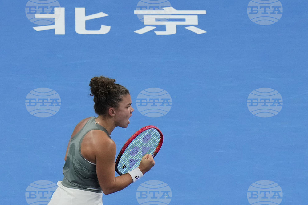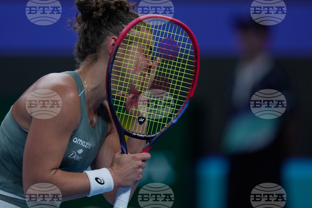 Marie Bouzkova of the Czech Republic reacts as she plays against Jasmine Paolini of Italy during the women's singles match of the China Open tennis tournament in Beijing, Tuesday, Sept. 30, 2025. (AP Photo/Mahesh Kumar A.)